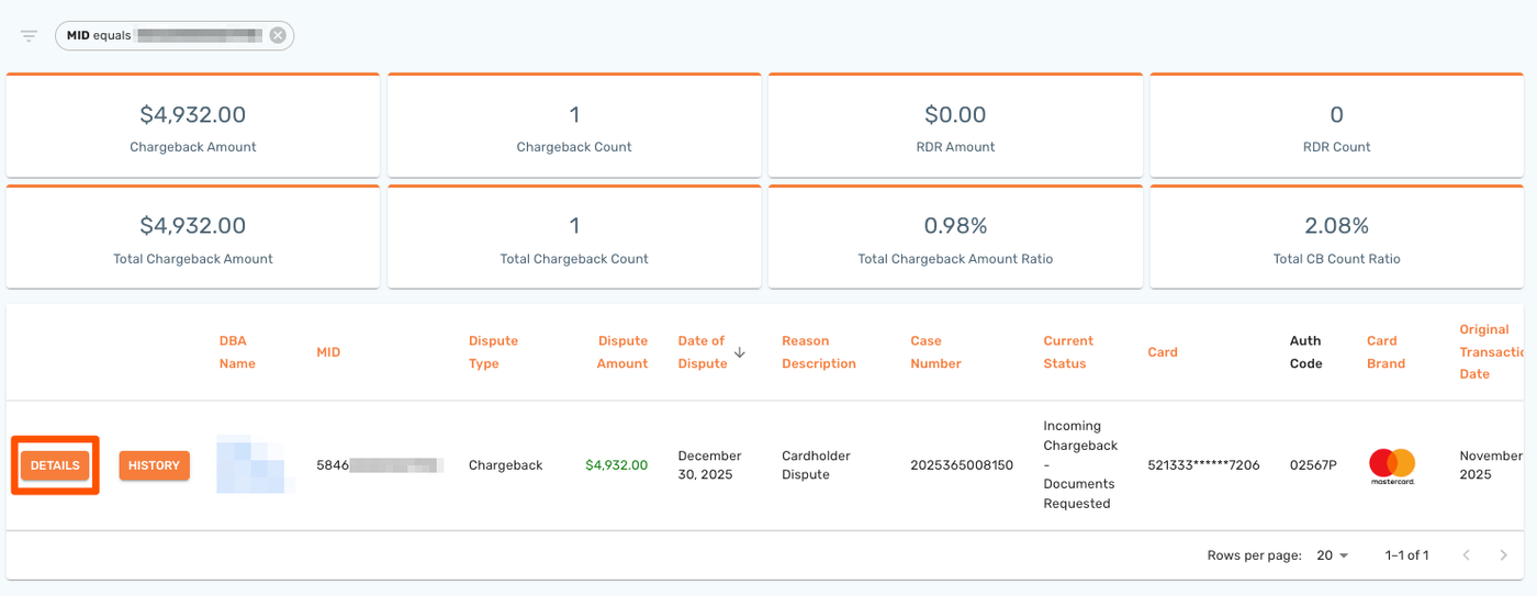 Dispute Transaction Summary: Here is where you can see the information you’ll need to look up the transaction in your processing system. The date of the transaction, the Auth Code, card brand, and the last four of the card number (redacted here).