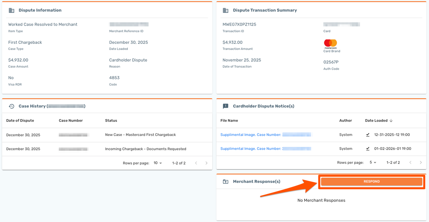 Merchant Response(s): This is where you will see your responses and be able to initiate your response to disputes or updates in the case. Note that responses can have supporting documents and you should provide as much as possible. Your typed response will be available in the Detailed Response section inside the Respond action.