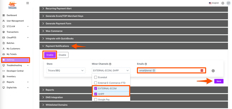 Here are steps to enable payment notifications and the specific settings you'd choose if you ONLY want those notifications to come from payment form/page initiated transactions: