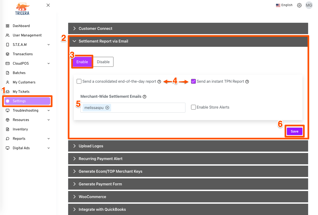 Choose either an end-of-day report or an instant report by TPN (this will give you an email from each device connected to your account)