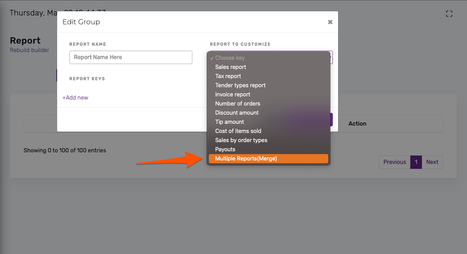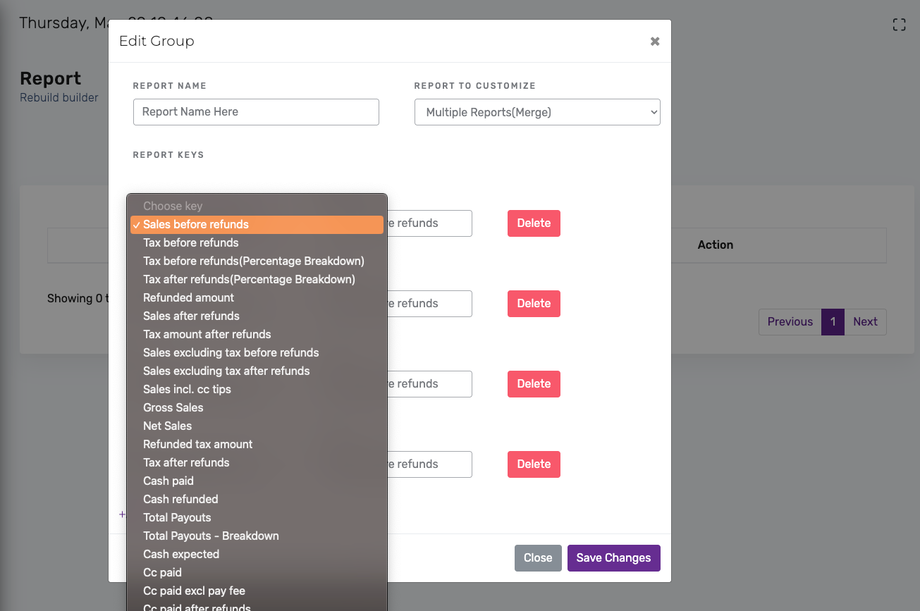 - Once you select which report to customize, you can add "keys" to your custom report. Keys are different data sets from the available report data. Continue to add additional keys by clicking Add New.