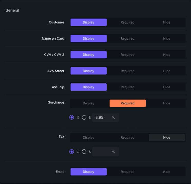 To adjust which fields should show, be hidden, or be required on the process transaction screen, go to Control Panel → User Management → Transaction Settings. Default settings for Surcharge and Tax can also be set here.