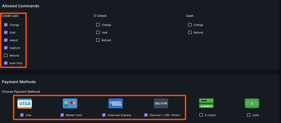 - Scroll down to Allowed Commands and Payment Methods. Match your selections to the image below: