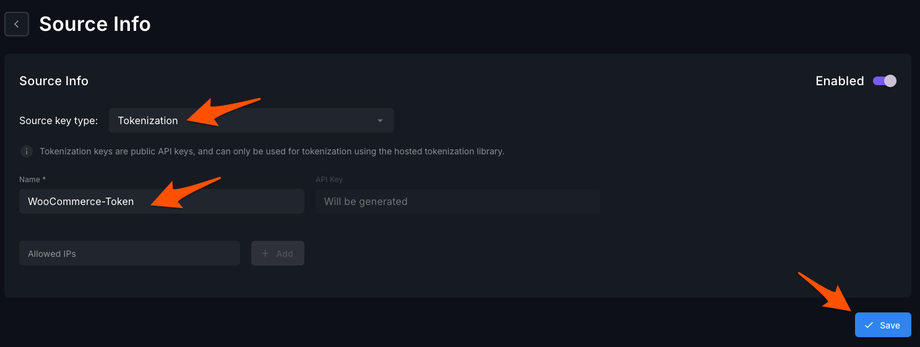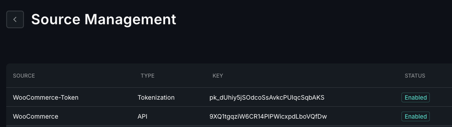 - From the Source Management screen, click Create New and select Tokenization. Name your key and hit save.