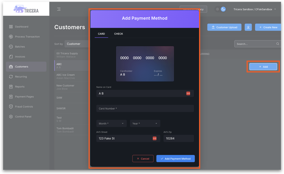 The Customers tab is where all your customer information, including payment methods, is securely stored. Creating and storing customer profiles allows you to easily select existing customers when processing transactions, creating invoices, etc., so that all relevant details are pre- filled.