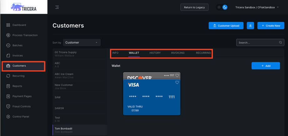 - For each stored customer, there are 5 tabs: Info, Wallet, History, Invoicing, and Recurring.