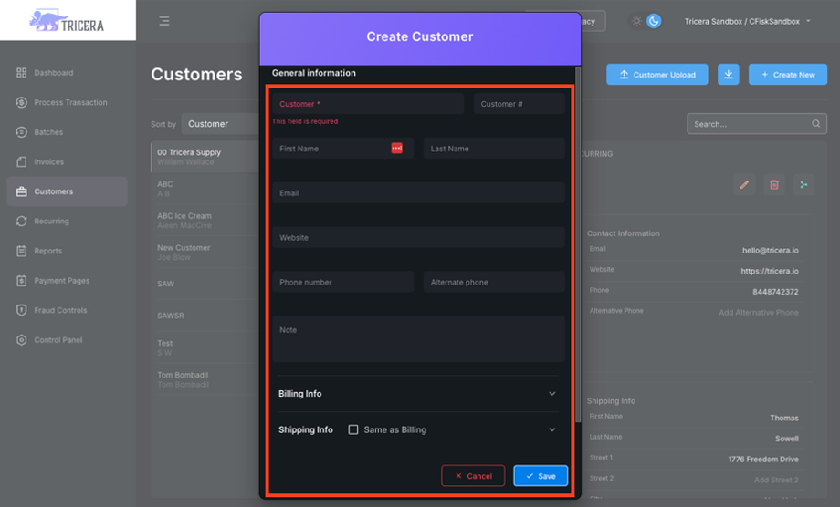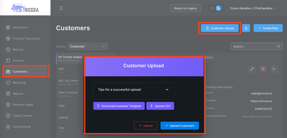 Customer Upload allows you to upload a CSV file to Tricera Secure with multiple customer profiles, rather than manually creating each one separately.