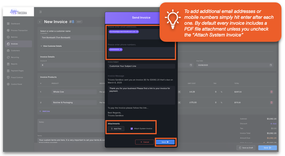 - Once you click Send, a window will pop up, allowing you to enter additional email addresses and/or cell phone numbers, customize the subject line and content, and attach files to the invoice.