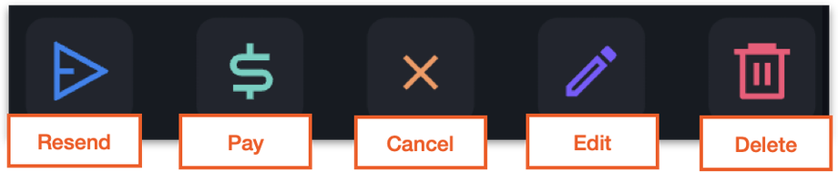 There are several options available once an invoice is sent. In the Invoices tab on the left panel, you’ll find a listing of all invoices. On the right side of each invoice (under Actions), up to five action options will appear.