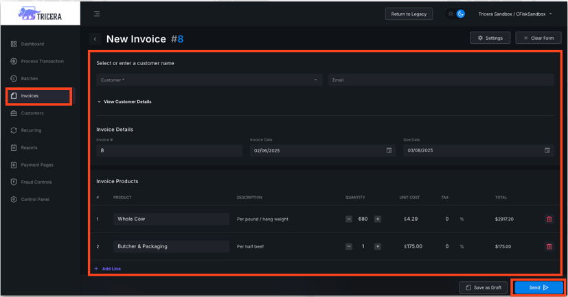 Invoices allows you to send an email or text message to a customer containing a secure link to a payment form where they can view and pay the invoice.