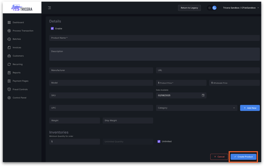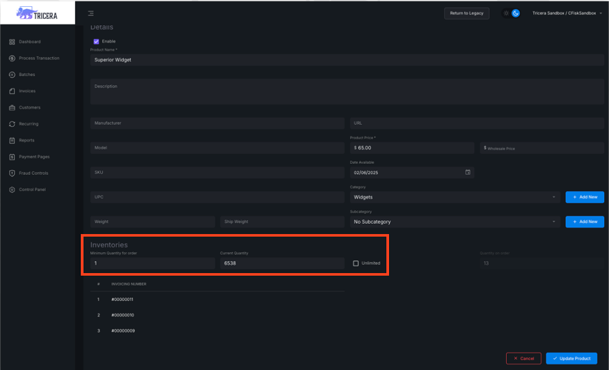 You can do basic inventory management with Tricera Secure. To track inventory, uncheck the Unlimited checkbox when creating your product and enter the current quantity.