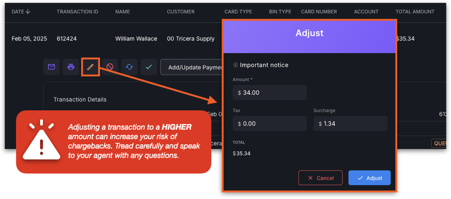 You can adjust the transaction amount if the batch has not yet closed. A transaction can only be adjusted once.