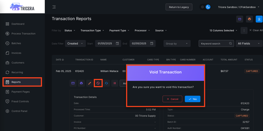 - To void or refund a transaction, navigate to the Reports tab on the left panel.